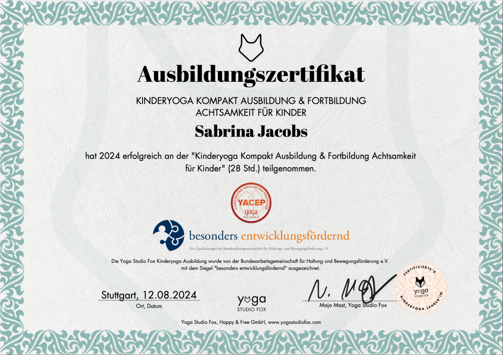 Als Kinderyoga-Lehrerin widme ich mich nun zusätzlich dem Thema Achtsamkeit und Selbstfürsorge mit Fokus auf die Kinder. Yoga kombiniert spielerisch Bewegung mit Atemübungen und Entspannungstechniken, die auf die Bedürfnisse und Fähigkeiten von Kindern zugeschnitten sind.